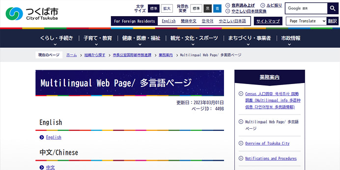 Tsukuba Municipal City homepage for Foreigner