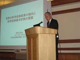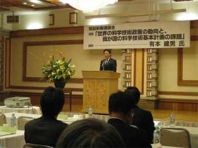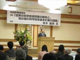 筑協では、例年、つくば市の新春賀詞交歓会に併せて総会を開催しておりましたが、今年は、会員機関並びに筑波研究学園都市の新たな発展に向けて、科学技術の動向に関する最新の情報を共有すべく、(独)科学技術振興機構 社会技術研究開発センター長 有本建男様を講師にお招きし、「世界の科学技術政策の動向と我が国の科学技術基本計画の課題」と題した講演会を開催いたしました。