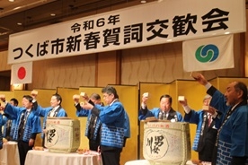 | 式次第 | 1. 開会 つくば市新春賀詞交歓会実行委員会副委員長 小原筑協会長 2. 実行委員長挨拶 五十嵐つくば市長 3. 祝辞 4. 樽酒の鏡開き 5. 乾杯 6. 歓談 7. 閉会 |